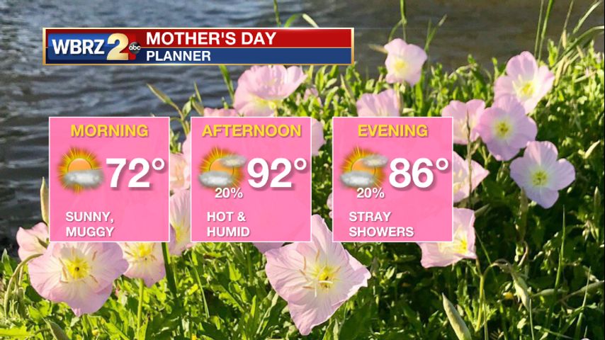 Tonight & Tomorrow: A quiet and muggy night is ahead. Beneath partly cloudy skies, low temperatures will slip into the low 70s. On Mother’s Day, you can expect plenty of sunshine early with some cumulus clouds bubbling up by the afternoon hours. With that, rogue showers or thunderstorms will try to develop, but coverage will remain spotty and showers will be short-fused. It will be steamy with high temperatures in the low 90s. While we are no strangers to highs in the 90s, our bodies do take some time to get used to it early in the season. With humidity, feels-like temperatures will be in the mid to upper 90s so be sure to stay hydrated and take it easy in the peak heat.