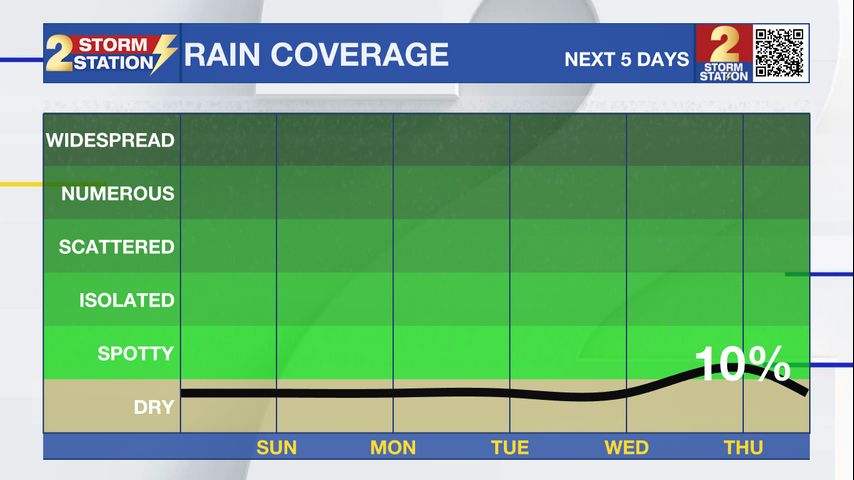 Up Next: Into next week, we will not be seeing much rain in the forecast which will not help our drought conditions in SE Louisiana. This dry air mass looks to stick around for the foreseeable future will will keep rain chances and humidity low. There is some early indications that there will be just enough moisture on Thursday and Friday to squeak out some showers especially near the coast. The coverage would be extremely minimal and it is too far out to say with confidence what will exactly happen.