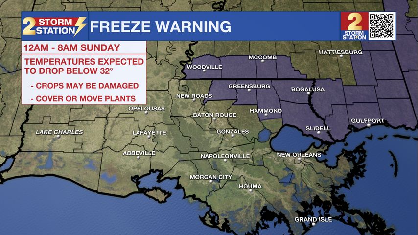 Tonight & Tomorrow: A *Freeze Warning* has been issued for some of the northern portions of the viewing area. This goes into effect from midnight, until 8am Sunday morning. Take steps now to protect tender plants from the cold. Also make sure pets have a warm place to stay. Elsewhere, frost will be a possibility. This will be especially true along and north of the I-10/12 corridor. After the cold morning start, temperature will make it into the upper 60's in the afternoon and evening. A few passing high and thin clouds cannot be ruled out.