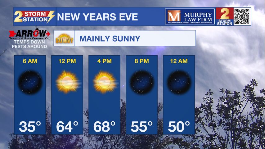 Tonight & Tomorrow: Lows tonight will be in the mid 30's with some locations getting near the freezing mark. Patchy fog will be a possibility. New Years Eve will be a great day for any outdoor plans and activities. Highs will be in the upper 60's under mainly sunny skies. For any staying up to celebrate the New Year, expect mainly clear skies with temperatures in the mid 50's.