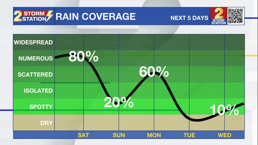 Behind Saturday afternoon's round of storms, the latter half of the weekend will be largely dry. Our next impact arrives early Monday to kick off the new workweek.