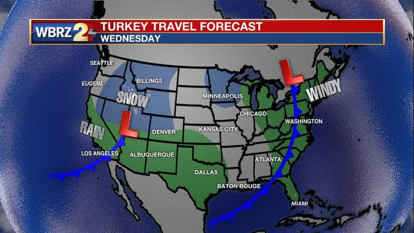 Up Next: A weak cold front will push the last of the rain through on Wednesday morning before stalling along the coast or just offshore. This stall will result in some clouds lingering Wednesday and perhaps through Thanksgiving. However, the front will not cause major changes in temperatures. Average, or even above average, temperatures are anticipated. As far as Thanksgiving travel is concerned, a significant storm system could cause delays in the Mountain West due to snow and Southwest U.S. due to rain. Windy conditions are anticipated in New England. Back home, Friday and Saturday will be warm with high temperatures approaching 80 degrees prior to the next cold front. That frontal system is pegged for late Saturday and will need to be monitored for multiple reasons—including the possibility of strong storms and timing implications for LSU and Southern football.