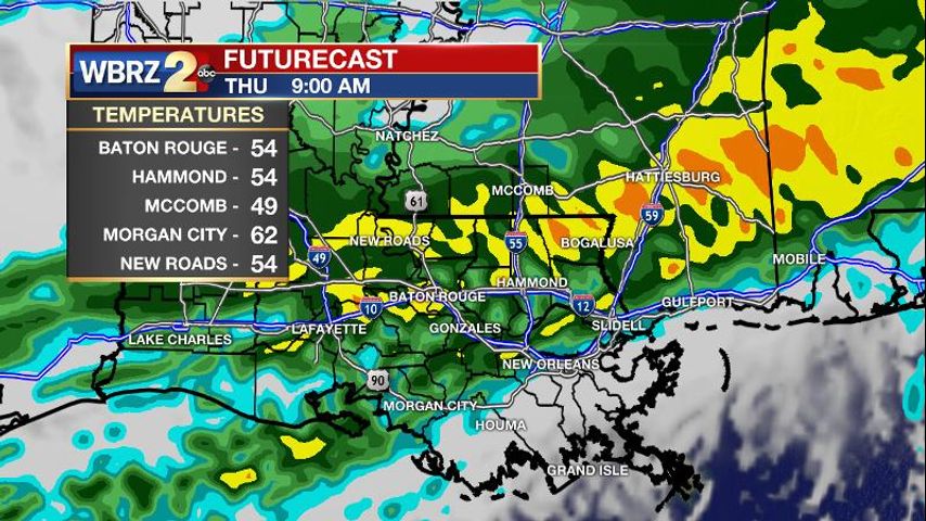 Today and Tonight: With a front stalling and weakening near the Louisiana Coast, clouds and cooler temperatures will rule the day. A few showers may linger behind the boundary, but like Monday and Tuesday, the activity should only be isolated to perhaps scattered. Highs will be in the low 60s. Overnight, rain is expected to increase with lows in the mid 50s.