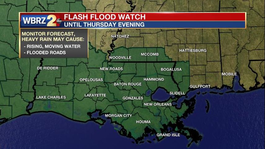 A FLASH FLOOD WATCH is in effect for the entire WBRZ Weather Forecast Area until Thursday evening. Additional rainfall of 1 to 3 inches with locally higher amounts will be possible. Areas of southern East Baton Rouge and northern Ascension Parishes are most prone to flooding issues because of 10-15 inches falling there since Monday. High rainfall rates could overwhelm drainage capacity. Ponding of water in low lying and poorly drained areas will be possible, and flash flooding could occur where the heaviest rain occurs.