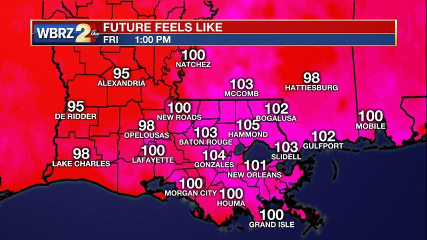 Up Next: A warmer atmosphere will encompass the central Gulf Coast through Sunday. Rain coverage will be at a minimum. High temperatures will be making it into the mid-90s, with some spots potentially reaching into the upper-90s. Heat index values will exceed 105 degrees for several hours each afternoon. High dew point temperatures will keep it stuffy overnight with low temperatures in the mid 70s. Showers and storm chances will bump up by Monday and some storms could produce gusty wind.