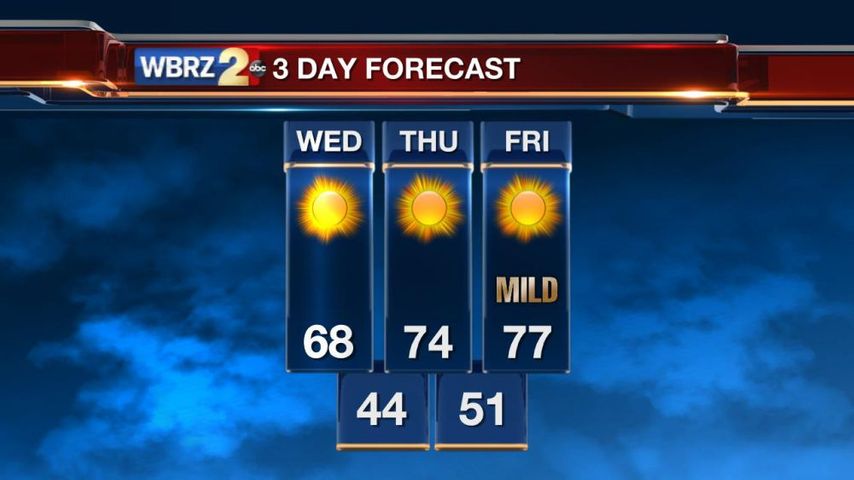 Up Next: Thursday and Friday will wrap the week up in dry and mild fashion. High temperatures are expected to reach the upper 70s both days beneath sunny skies. Lows will be in the mid 40s Thursday and low 50s on Friday. The weekend will continue a mild pattern with highs in the upper 70s. A few clouds may be introduced during the afternoon hours with fog during the mornings.