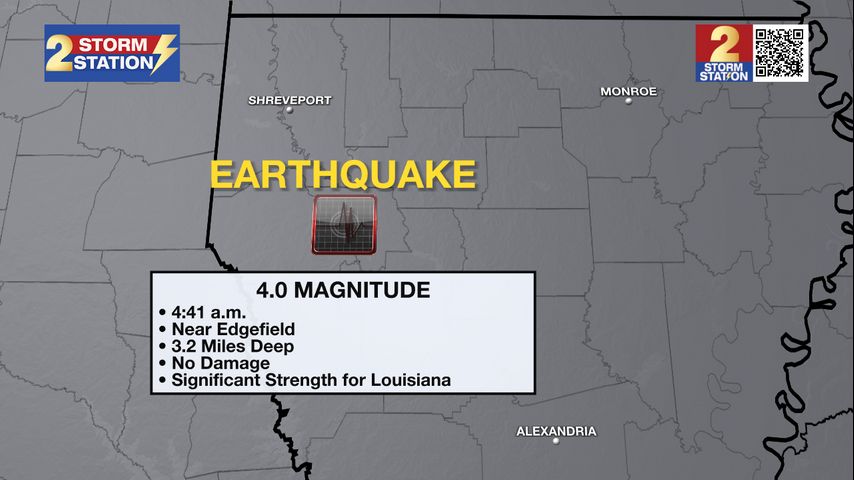 The U.S. Geological Survey reports a magnitude 4.0 earthquake hit just north of Coushatta, Louisiana, at 4:41 a.m. on Monday. The quake occurred at a shallow depth of about 5 km (around 3 miles).