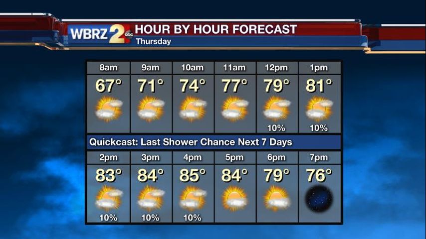 Today and Tonight: We’ll continue to carry the mention of a “spotty shower” in the forecast through Thursday, but most locations will continue to stay dry. Partly sunny skies will allow highs to peak in the mid 80s with light southeasterly winds. Overnight, skies will go mostly clear with a low in the low 60s.