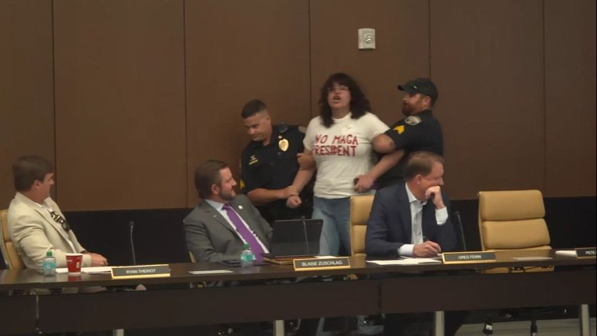 WBRZ was at the meeting where student Gabriela Juarez was forcefully removed by LSUPD officers while wearing a shirt that said "NO MAGA PRESIDENT." She and other students were protesting appointments to the LSU Board of Supervisors by Gov. Jeff Landry.