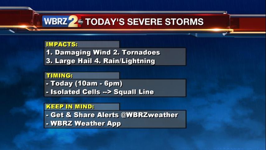Actions: Be alert to rapid changes in weather, have access to bulletins through the WBRZ WX app., the WBRZ Cable Weather Channel, WBRZ Weather on Facebook and @WBRZweather on Twitter. With both the weather app. and Twitter, you can change your cellular phone settings to allow push notifications and alerts for updates from the WBRZ Weather team. PLEASE share information with those that do not have access to digital media sources. Share Facebook posts and retweet alerts from our weather team. Make a phone call to those without TV or internet. Any such step could be life saving. Secure loose outdoor objects. Move cars under covered areas where possible. Review storm safety plans with friends and family. Understand the difference between a watch and a warning. A watch means conditions could lead to the development of severe weather. A warning means severe weather is happening and you need to take action.