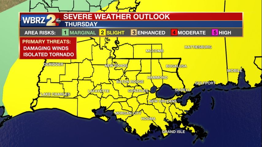 The WBRZ viewing area is under a SLIGHT (2/5) risk for severe weather on Thursday associated with this line of storms. This means any storms that move through will be capable of producing damaging straight-line winds as well as a tornado or two. Stay with the WBRZ Weather Team this week as we continue to update the forecast and timeline on this potential severe event.