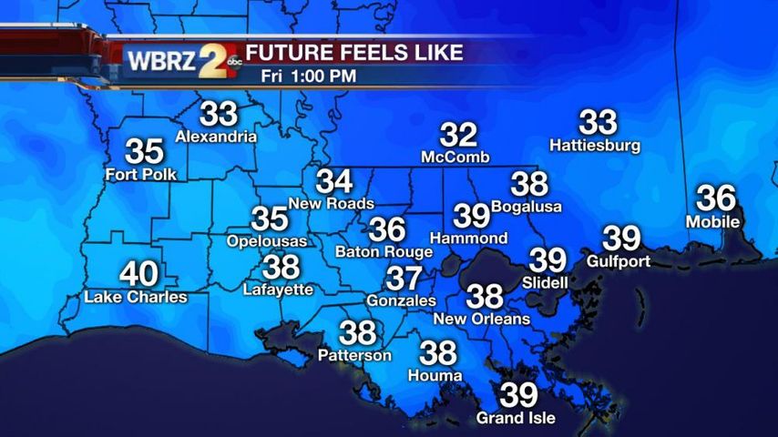 Today and Tonight: Friday will be wintry by local standards. Overcast skies may persist throughout the day as cold air continues to seep into the Gulf South. Temperatures will struggle to leave the low 40s. Winds will be stiff out of the north at 15-25mph. The cloud cover and wind combination will keep “feels-like” temperatures, or wind chills, in the 30s through the day. There may even be some lingering drizzle, with a flurry possible in Southern Mississippi. Overnight will feature clearing skies. It will be blustery and quite cold with lows a few degrees below freezing and wind chills in the low 20s.