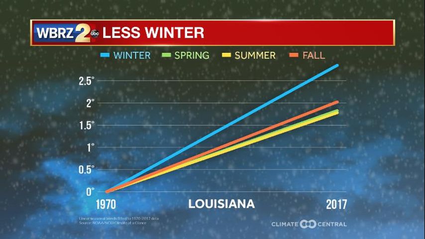 It is not just about shorter stretches of cold temperatures; climate change is causing a general rise in average temperatures throughout the year. Some seasons are warming faster than others. Winter is the fastest-warming season in 38 states, including Louisiana.