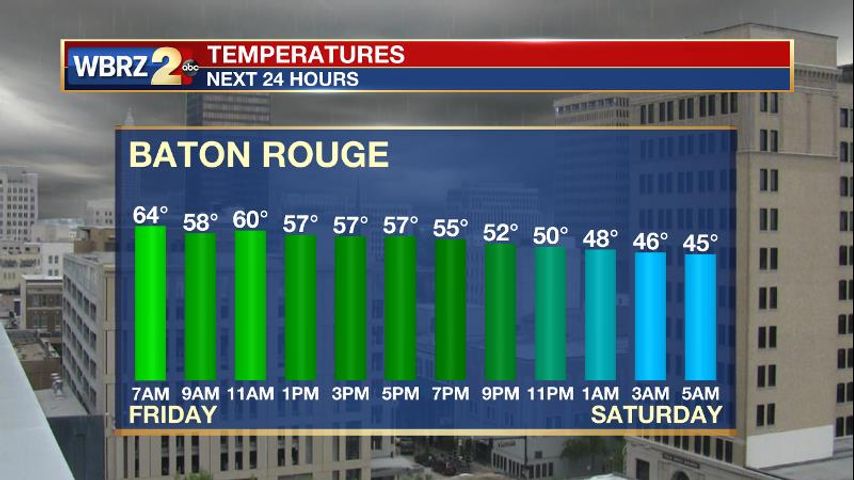 Today and Tonight: Friday will be yet another dreary one as a cold front chugs through the area. Showers will carry through much of the day as northerly winds transport much cooler air into town. Look for early day highs in the 60s and late afternoon temperatures in the low to mid 50s. Showers will end overnight with thermometers tumbling into the mid 40s.