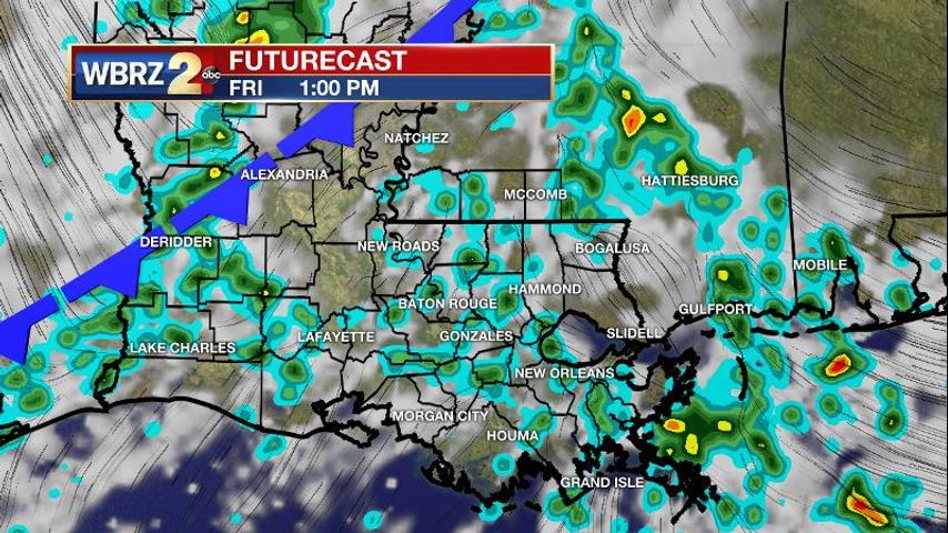 At this time, the WBRZ Weather Team expects showers to end Friday night with some lingering clouds Saturday morning followed by sun later in the day. Temperatures will be near 60 degrees at daybreak and barely sneak into the 70s during the afternoon. For LSU and Southern fans, this could mean that jackets are needed for morning tailgates and the evening games! After a cool Sunday morning, thermometers will quickly return to average for Sunday afternoon into early next week. Showers and thunderstorms will be in the forecast Monday to Wednesday ahead of the next front.