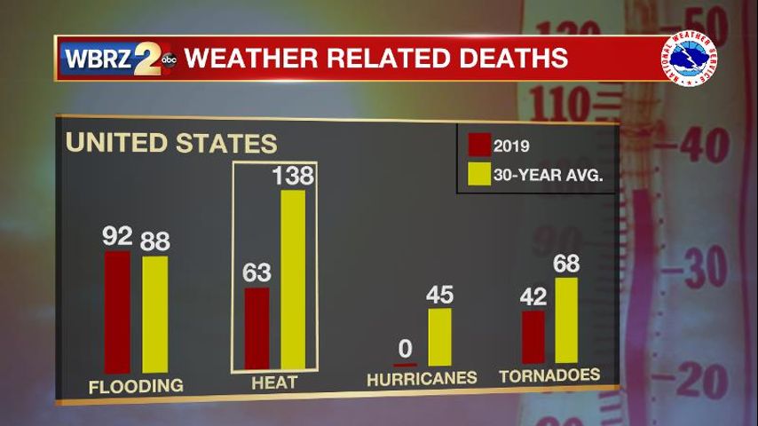 The latest run of heat is not unusual for the Baton Rouge area. The strong of advisories and warnings issued by the National Weather Service should not be taken lightly though. Many would be surprised to learn that data collected by the National Weather Service (NWS) and Centers for Disease Control (CDC) shows heat to be the number one weather related killer. Heat, known as the silent killer, accounted for more deaths than hurricanes and tornadoes combined in 2019 and over a 30-year average. Flooding is the second leading weather killer.