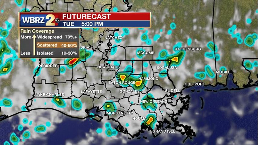 Monday’s rain coverage was right in line with expectations of scattered activity. The green shading, indicative of measurable rain, covered approximately 50 percent of the 13 Parish, 3 County WBRZ Weather forecast area. Approximately 1-2 inches of rain fell in portions of Iberville and Pointe Coupee Parishes due to the slow-moving summer storms.