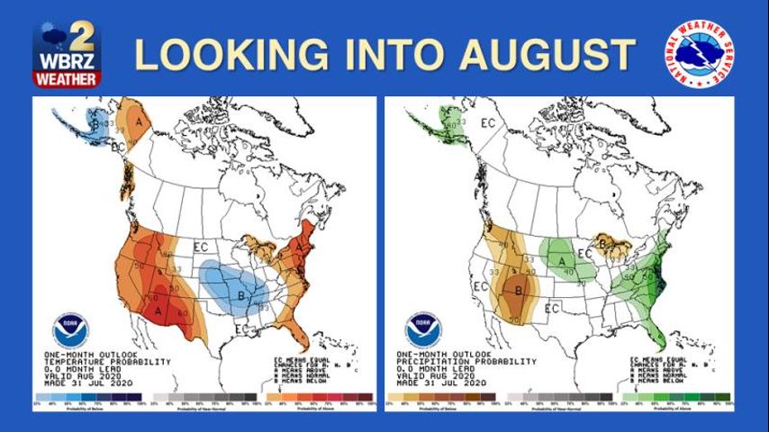 Though slightly lower humidity is possible through Thursday morning, a stale summer pattern is locking into place. This is typical of August, heat and humidity reign while coastal communities watch the tropics—this year looks similar. Below, we have the outlook for the August 2020.