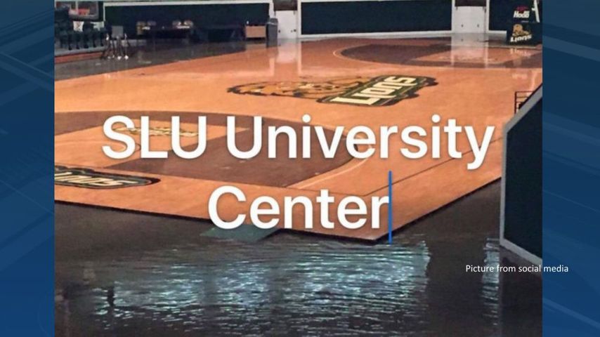 A picture circulating on social media was confirmed to be accurate by a WBRZ producer. The picture showed water surrounding the wooden basketball court of the iconic indoor athletic arena north of downtown Hammond on the campus of SLU.