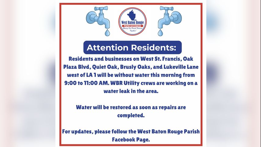 Some West Baton Rouge residents will be out of water for a portion of Wednesday morning due to a leak