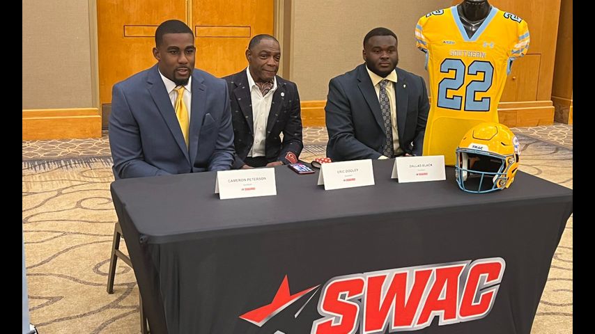 Head Coach Eric Dooley, Cameron Peterson, and Dallas Black represented the Jaguars at the SWAC media day on Thursday. Southern will open the season at home against Florida Memorial University on Sept. 3.