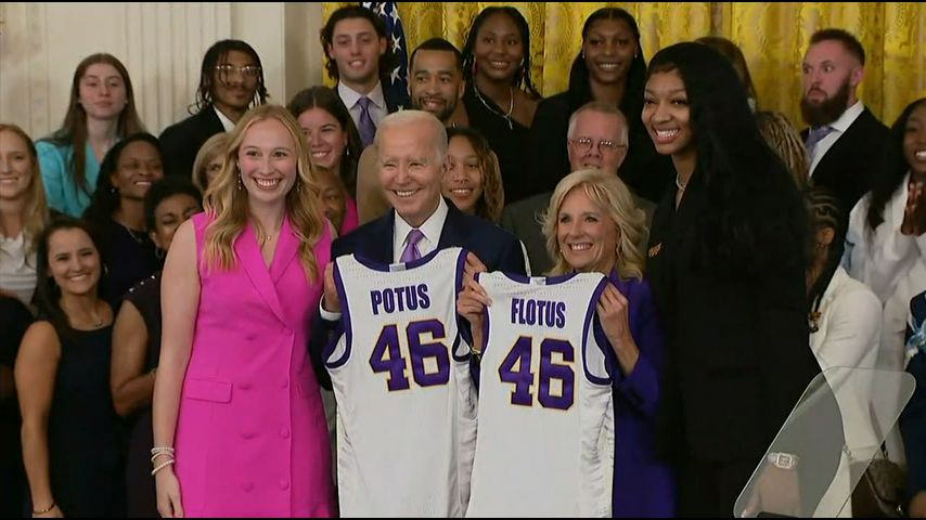 Mulkey later called on Angel Reese and Emily Ward to present President Biden and First Lady Jill Biden with custom jerseys labeled "POTUS" and "FLOTUS".
