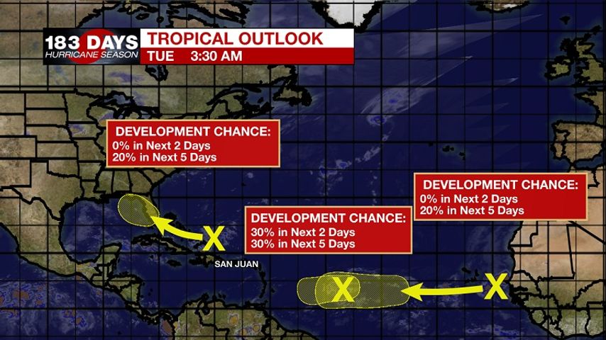 The second is a weak area of low pressure located more than 900 miles east of the Lesser Antilles which is continuing to produce disorganized showers and storms. Some slow development of this system is possible during the next day or two before upper-level winds become unfavorable for tropical cyclone formation. This system is expected to move slowly westward across the tropical Atlantic Ocean for the next several days. The National Hurricane center is forecasting a 20% chance of tropical development within the next 2 days, which increases to a 20% chance within the next 5 days.