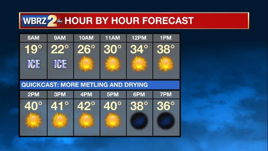 Today and Tonight: Thermometers will climb above freezing by noon Thursday. With ample sunshine, there should be a 5 to 6 hour window for the combination of daylight and above freezing temperatures for significant melting and evaporating of ice. Most of what is left on the surface streets should be gone after today and significant improvements should be noted for shaded and elevated areas as well. Highs will top out in the low 40s during the afternoon hours. Winds will be a bit lighter, meaning wind chills will not be an issue during the afternoon, but certainly stay bundled up as it remains cold. Tonight, skies will stay clear and temperatures will dip below freezing after 8pm. Ultimately, look for lows near 27 degrees.