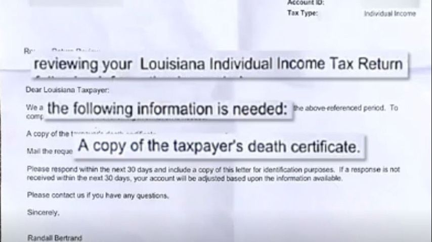 BATON ROUGE - For tax purposes, a man was asked to send in his death certificate to the Louisiana Department of Revenue — but he's not dead!