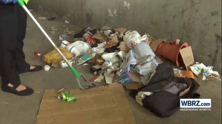 BATON ROUGE - Mounds of trash, discarded cardboard signs and a mattress are just some of the items that can be found underneath the I-10 overpass on Siegen Lane.