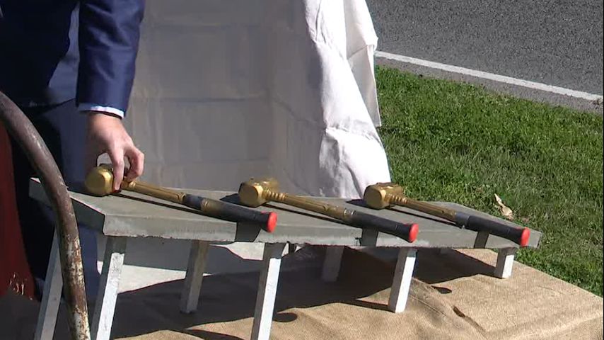 At a news conference in front of the exit, the trio held a ceremonial "smashing" of the Washington Street exit ramp with golden spray-painted hammers.