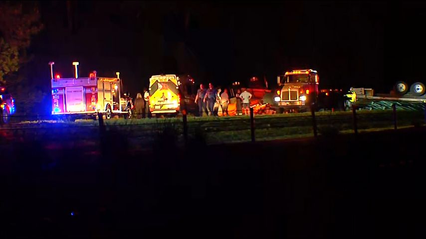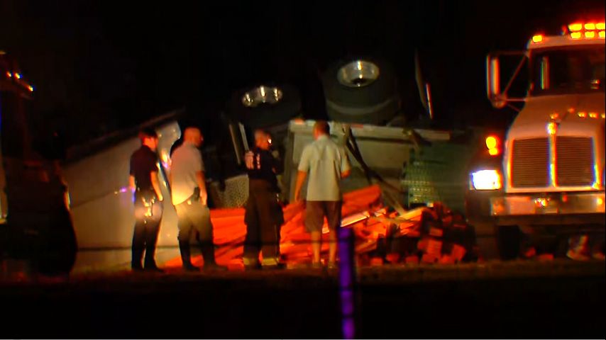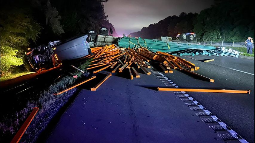 Video showed the truck on its side and what appeared to be steel beams spilled onto the roadway.