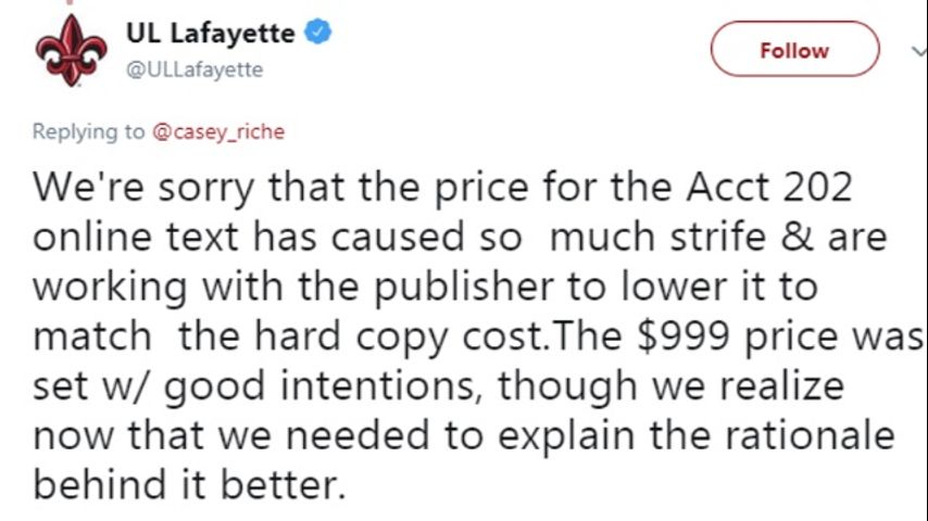 LAFAYETTE - Some students at the University of Louisiana-Lafayette are upset about the price of an online textbook.