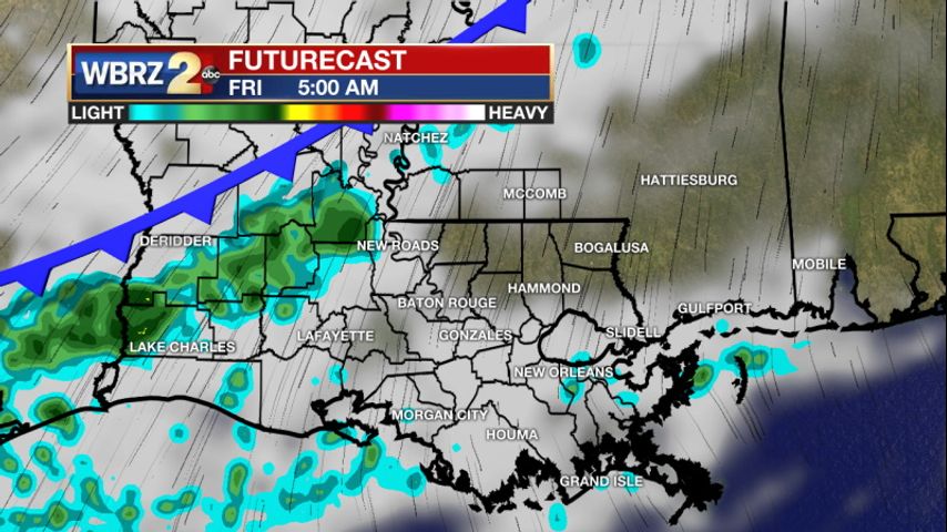 Up next: The cold front will be through the area by the late morning hours on Friday. At this point, the clouds will move out and showers are no longer in the forecast. Temperatures will struggle to heat into the 70s and we will spend most of the day with temperatures in the 60s. When the sun goes down on Friday, temperatures will drop fast. Areas north of Baton Rouge may see temperatures in the upper 40s and everyone else will see temperatures in the 50s.