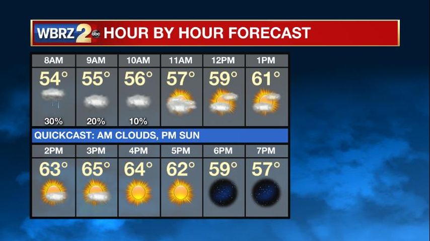 Today and Tonight: Clouds and showers will quickly exit the area on Thursday morning. Skies will clear from north to south with sun in southwest Mississippi as early as mid-morning, the Baton Rouge area around lunchtime and the Louisiana Coast by late afternoon. However, even as some sunshine returns by afternoon, temperatures will not be able to leave the mid 60s thanks to northerly winds of 5-10mph advancing cooler air into the region. Thursday night will be chilly with low temperatures dipping into the upper 40s north of I-10 and low 50s south. Skies will be clear and winds will be light.
