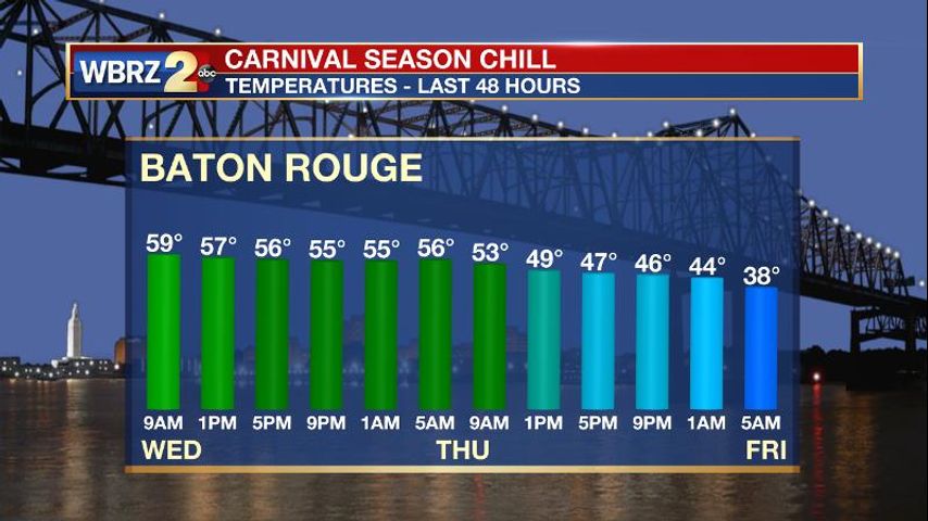 Up Next: The weekend will start cold cool and quiet conditions. The forecast looks excellent for the Spanishtown Mardi Gras parade, rolling Saturday at noon. Afternoon highs will warm into the upper 50s. Some clouds will build on Sunday as thermometers return to the 60s. The day will stay dry though. The next fast-moving disturbance will swing into the area on Monday with a few showers and thunderstorms possible into early Tuesday. The middle to end of next week is likely to feature well below average temperatures.