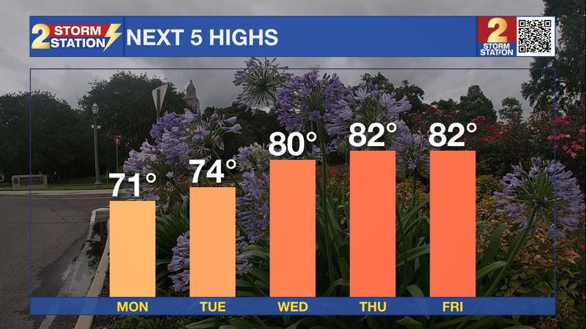Up Next: Dry conditions will persist until at least Tuesday. Highs return to the 80s by Wednesday. A few spotty showers will be possible but most will stay dry. The greatest rain chance will hold off until Thursday and Friday. The best day for showers and thunderstorms as of now is Friday. There is some indications that some of these storms could be on the stronger side, but uncertainty is still high at this time on any severe weather threat. Some of these storms could linger into Saturday as well.