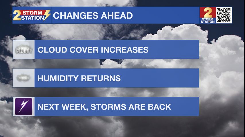 Today & Tonight: Skies will be mostly cloudy today. Southerly winds will bring moister air into the region. This will make the humidity get to noticeable levels. Even with all the clouds, highs will still reach the lower 80's. A stray sprinkle can not be ruled out but the vast majority will stay dry. Most rain stays well to our northwest through the end of the weekend. Skies will stay mostly cloudy overnight, keeping lows to near 67 degrees.