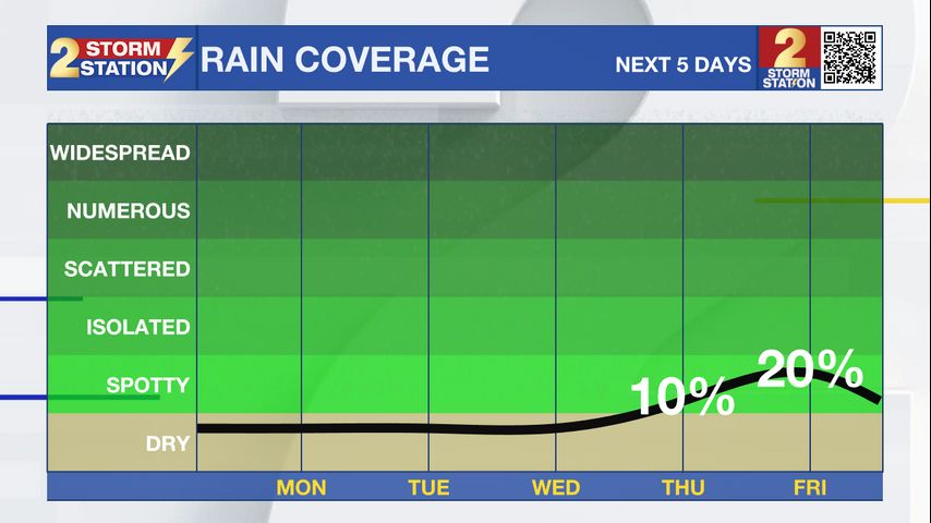 Up Next: High clouds will move into the area early on Monday. This will make for filtered sunshine instead of completely sunny skies. These should generally clear out by Tuesday. Temperatures will slowly start to rise by the middle of next week. By Wednesday, high temperatures could be maxing out in the mid to upper 80's. Rain chances will start to go up starting on Thursday. There will be a slight chance for rain on Thursday followed by a greater chance on Friday. This could potentially last into the weekend. Given this is far out, there is still some uncertainty in the exact rain coverage and how long it will last. Details will start to become more clear in the coming days.