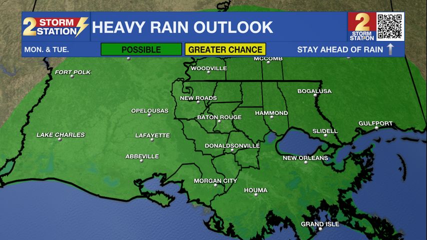 Up Next: Rain coverage is expected to be a lot higher tomorrow. Activity will generally stay more isolated for the first half of the day. Coverage will increase as we get into the afternoon and evening. The best chance for rain will be overnight Monday and early Tuesday. This is when numerous showers and thunderstorms will be possible. Over the course of Monday and Tuesday, heavy rainfall will be possible. Isolated instances of flash flooding can not be ruled out. There will also be a low end threat for severe weather. Damaging wind gust and hail will be the main concerns.
