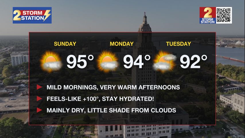 Today & Tonight: It is now the fall! In typical Louisiana fashion, temperatures will still be in the mid 90's. Humidity will cause feels like temperatures to be 100°+. There will be a lot of sunshine, so make sure to wear sunscreen if outside for an extended period of time. Tonight, lows will be near 72 degrees under mostly clear skies.