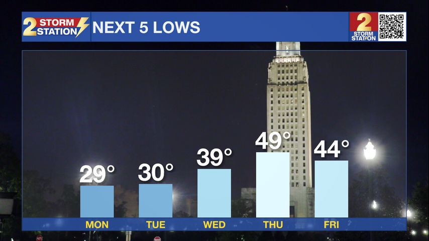 Up Next: Sunday night through Tuesday morning brings the coldest stretch of the forecast. Areas along and north of I-12 could see temperatures in the upper 20s each morning, while Baton Rouge and areas farther south fall into the 29-33 degree range. Afternoon highs gradually rebound into the upper 50s by midweek.