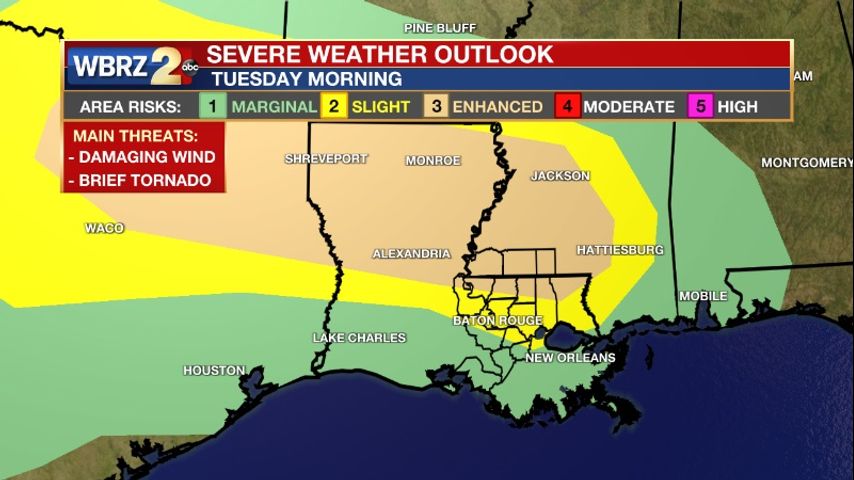 There is now an Enhanced (Level 3/5) risk for severe weather Tuesday morning for southwest Mississippi and the neighboring Florida parishes. A line of intense thunderstorms is expected to track across central Louisiana and eventually into northern portions of the WBRZ viewing area. Location is super important this go around of severe weather. If you live south of I-10, your severe weather risk is significantly lower than those that live north of I-10/12. In fact, coastal parishes may miss out on the rain all together. The main concern with this line of storms will be damaging winds, although a brief tornado can not be ruled out.