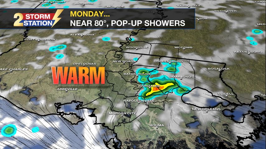 Tonight & Tomorrow: Expect partly to mostly cloudy skies across the region on Sunday night. Patchy dense fog is not off the table late. Should that occur, be sure to use the low beam headlines and be ready to encounter any slowdowns for the morning drive. Overnight lows will run about 20° above average, in the low to mid-60s. It will still be unseasonably mild on Monday with a high in the upper-70s, close to 80°. There will be enough warm and humidity to pop a few afternoon showers or thunderstorms. These will be of the isolated variety, with roughly a third of the Capital Area encountering them. After nightfall, there will be a short period of clearing as leftover showers fizzle out. That will be followed by areas of fog late.
