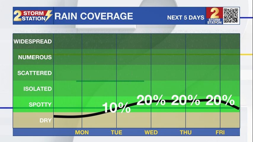 Up Next: Tuesday starts the return of the humidity. It will not be extreme yet, but it will be the first day it will start to feel slightly muggy. There is also the outside shot at a shower or two but the vast majority will stay dry. Rain chances will start to really ramp up Wednesday through Friday as moisture surges into the area. Rain coverage is held at 20% for Wednesday and Thursday, but are bumped up to 30% for Friday as that looks to be the wettest day. After that, confidence in the forecast decreases as models have trended to the drier airmass arriving later than originally thought. This could potentially make the weekend wetter than expected. Trends will need to be monitored and confidence in the forecast should increase in the coming days.