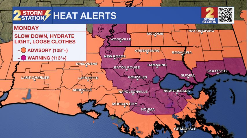 Tonight & Tomorrow: After a very hot day, the capital region won't experience much relief into the nighttime hours. Sunday night features partly cloudy skies with a low temperatures near 80° in Baton Rouge. The heat will show no signs of letting up as highs climb into the upper-90s on Monday. Peak feels-like temperatures go even higher, topping out in the 115-117° range. For this reason, another Excessive Heat Warning will also be in effect from 10 a.m. to 7 p.m. Monday. For the few parishes not included in the warning, there is a Heat Advisory in its place.