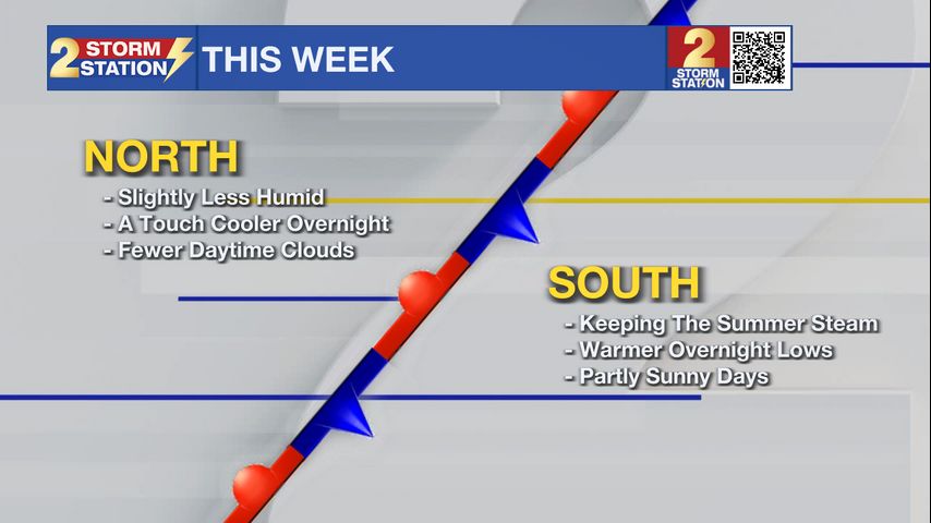 Up Next: The previously mentioned front will hang out in the area through the rest of the week, dividing humid air from a slightly less steamy feel. Subtle shifts in the front’s position will result in changes in who sees what from day to day. Southern areas have a higher chance of keeping the humidity, whereas northern sections are more likely to benefit from a nose of dry air on a given day. Overnight lows will be tied to the humidity level — less steam means cooler overnight lows. But in general, highs will be close to average in the low to mid 90s. Near to slightly below-average lows are expected, in the upper 60s to lower 70s. As for rain, it won’t be plentiful. Stray showers will be the exception as opposed to the rule through Thursday. There’s a slightly better shot at coming across an isolated storm by late week.