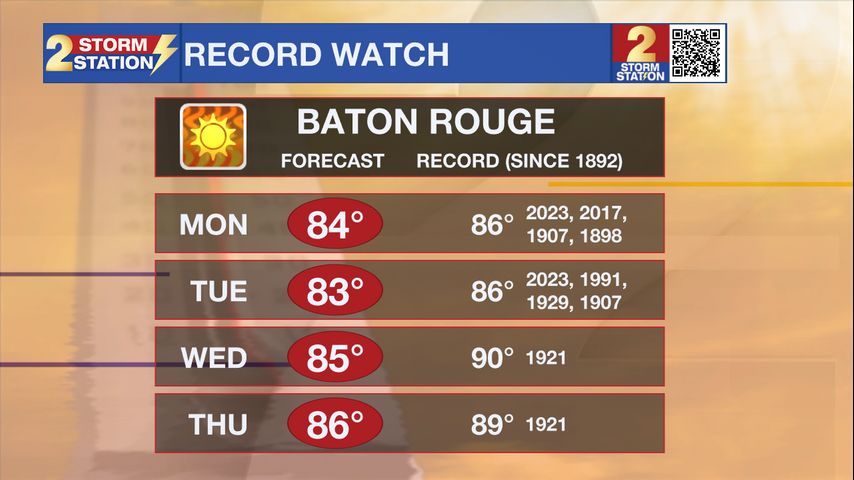 Once the sun gets to work, any fog will burn off quickly, leaving behind a beautiful afternoon with a high temperature near 84°. It’s worth noting that the record in Baton Rouge is 86° (2023, 2017, 1907, 1898).