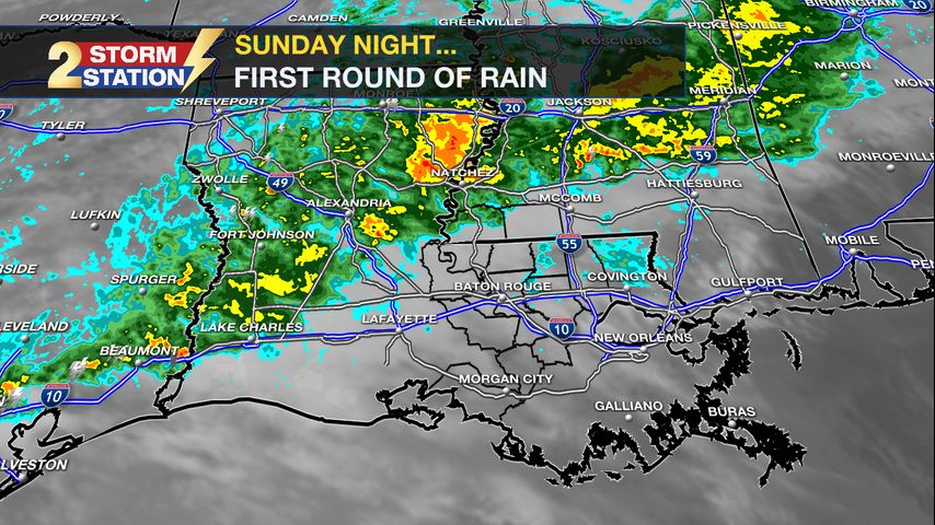Tonight & Tomorrow: Clouds have returned ahead of the Capital Area’s next round of precipitation. This time, there will be no wintry mischief; everything will fall in liquid form. Be prepared to face a few sprinkles on Sunday evening. For areas north of Baton Rouge (i.e. closer to the LA/MS border), rainfall rates could end up a bit higher. Full-fledged showers will be possible during the evening in these locations. Guided by a weak cool front, those scattered showers will work their way closer to the Baton Rouge Metro overnight. A few of them could carry over into the morning drive, but it should not be a constant deluge. Rain totals will likely be under half an inch for most, but a few areas near the state line might see accumulations closer to an inch. It will be mild overnight, with a low in the mid to upper-50s. Early morning showers will exit to the east within the first few hours of daylight. The area will be dry by late morning, with partial clearing expected for the afternoon. Highs will be seasonable on Monday – near 65°.