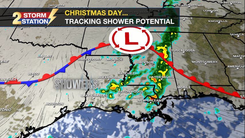 Up Next: While rain coverages decline the day after Christmas, that will not mark the end of the warm and unsettled pattern. A few more round(s) of rain could arrive by Friday and Saturday. A cold front appears to finally move through on Sunday, but even that won't produce a major temperature drop.